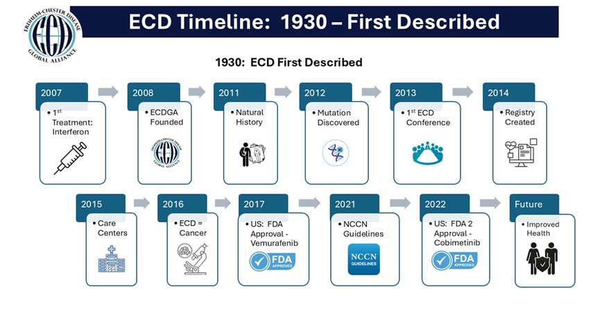 20131st ECD International Conference held in San Diego, CaliforniaIn addition to the patient meeting, the first international meeting was held this year, inviting doctors to present ECD research, case studies, and treatments. This meeting was also the catalyst for collaboration in developing the significant 2014 Blood Journal ECD Consensus document. Collaborative annual conferences have continued to take place around the world each year.